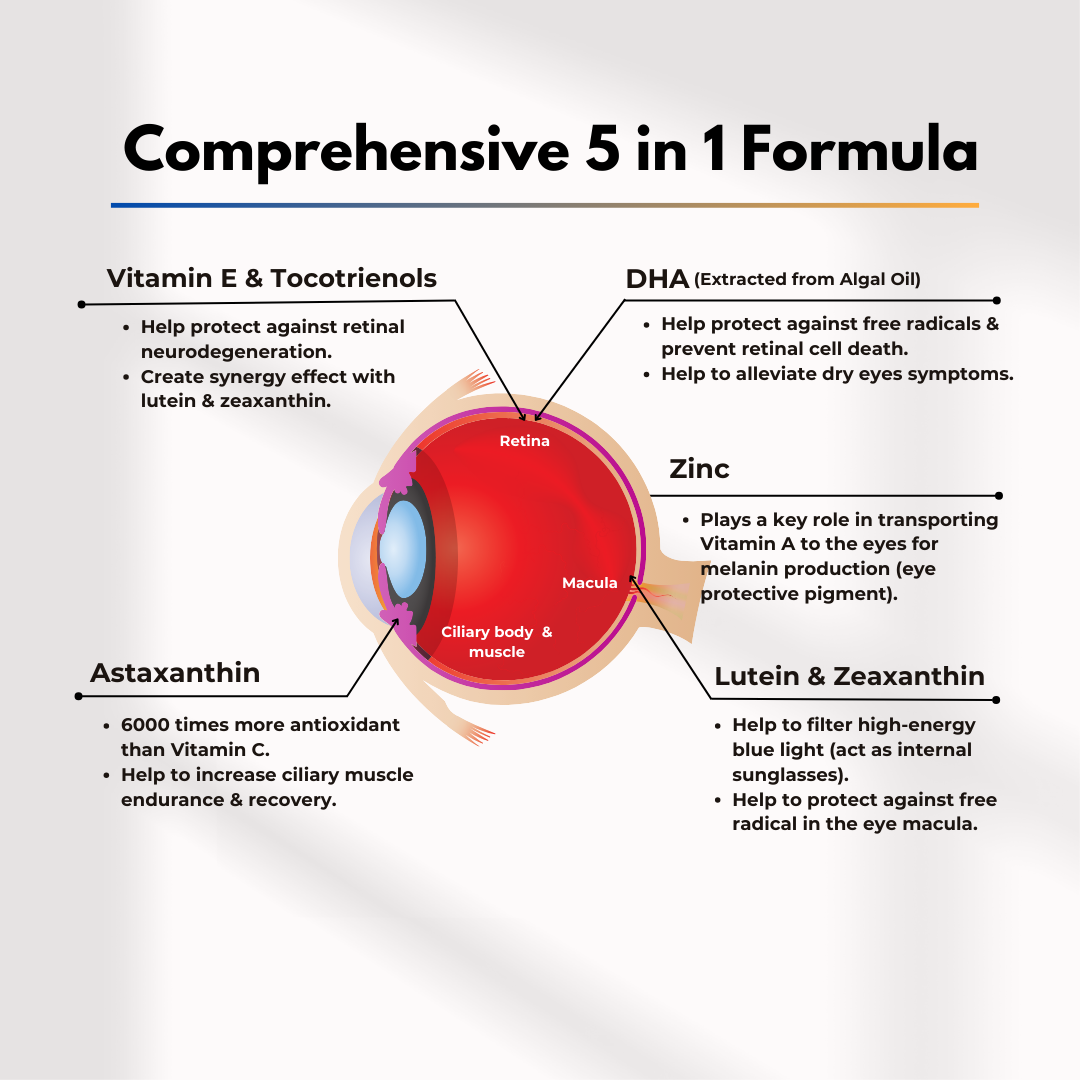 Lutein10mg Zeaxanthin2mg Astaxanthin4mg Total Tocotrienols29mg Vitamin E (Tocopherol)15IU DHA (Algal Oil)60mg Zinc5mg