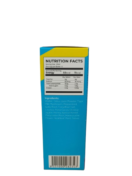 Saiz Hidangan: 20ml 🇲🇾 Bahan-bahan:Air, Serbuk Jus Sitrus, Cendawan Susu Harimau, Pudina, Akar Isatis, Buah Forsythia, Akar Licorice, Poria Cocos, Kurma Merah Cina, Madu Semula Jadi, Biji Aprikot, Akar Platycodon, Bunga Honeysuckle, Poria, Pokok Hati-Hati (Heartleaf), Stevia.